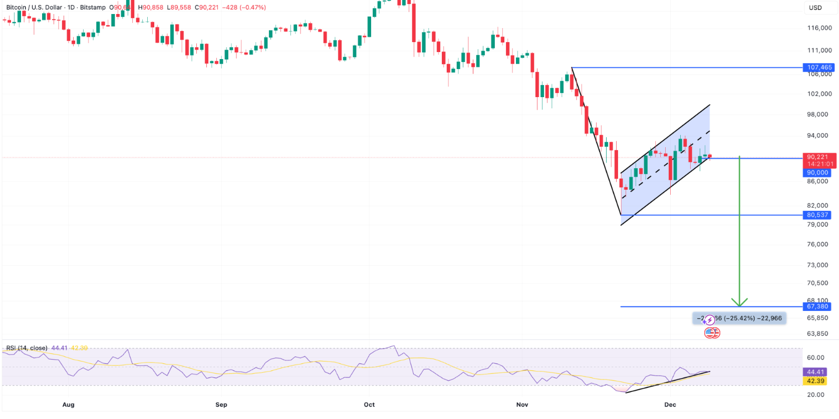 “比特币昨日几乎测试了首个阻力区水平。目前仍处于看跌旗形内部,很可能再次下探86,000-87,000美元支撑区间。若比特币上涨,将面临92,216美元阻力位,随后是98,000美元附近的旗形上轨阻力。”