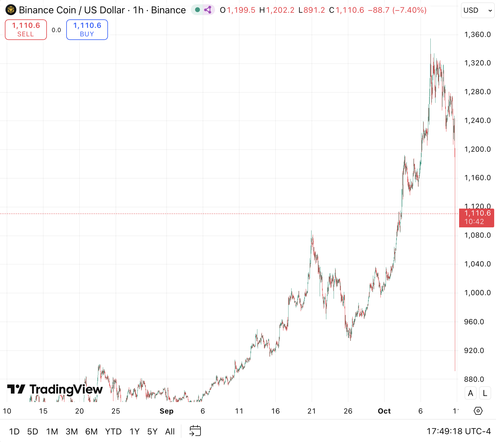 BNB单日暴跌10.4% 价格回落至1110美元附近