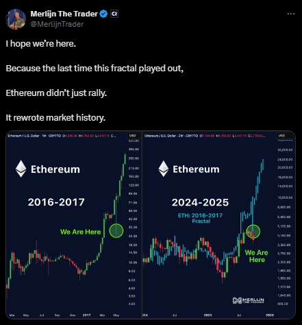 分形理论认为价格模式会在不同周期重复出现。据此观点,以太坊在深度调整后正处于突破前的筑底阶段,这一判断取决于未来数周能否维持需求及趋势支撑。若历史重演,ETH或将再次改写历史。 | 来源:Merlijn, X