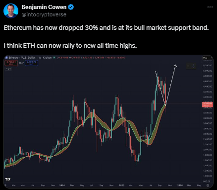 链上记录显示,BitMine近期通过Kraken热钱包转移约2.7万枚ETH(价值1.04亿美元)至托管账户。分析师认为,这种规模的交易表明机构正在弱势中布局。Benjamin Cowen指出,以太坊已完成30%回调并触及关键趋势带——由20周EMA和21周SMA构成的"牛市支撑带"。若该区域持续承托,价格仍有望冲击5,000美元目标。