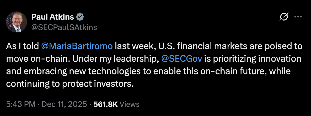 在阿特金斯发表声明的同日,金融服务公司摩根大通为加密投资公司银河数字控股完成了5000万美元的代币化债券发行。随着SEC对DTCC的批准及阿特金斯的表态,加密交易所也在积极拓展代币化产品交易。美国加密货币交易所Coinbase最早可能于周三宣布进军代币化股票和预测市场。该公司向Cointelegraph确认将举办新品发布会直播,但未透露具体产品细节。