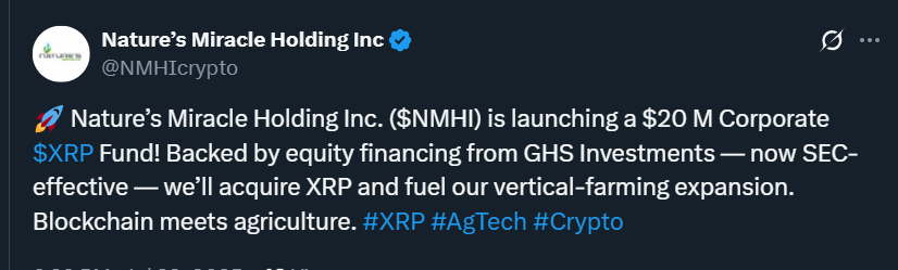 垂直农业技术公司Nature’s Miracle Holding周三宣布将设立规模高达2000万美元的企业XRP储备计划,此举使其成为首批将XRP作为核心储备战略的上市公司之一。多位分析师预测该代币价格将达10-15美元,加之《天才法案》的通过,可能促使更多企业效仿XRP储备策略。