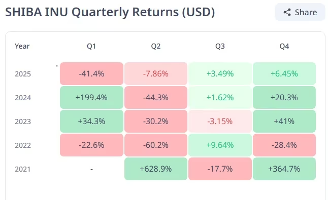 回顾柴犬币的历史表现,第四季度往往表现亮眼。2021年SHIB曾暴涨364%,但2022年下跌28.94%。柴犬币季度收益率(美元)图表来源:CryptoQuant