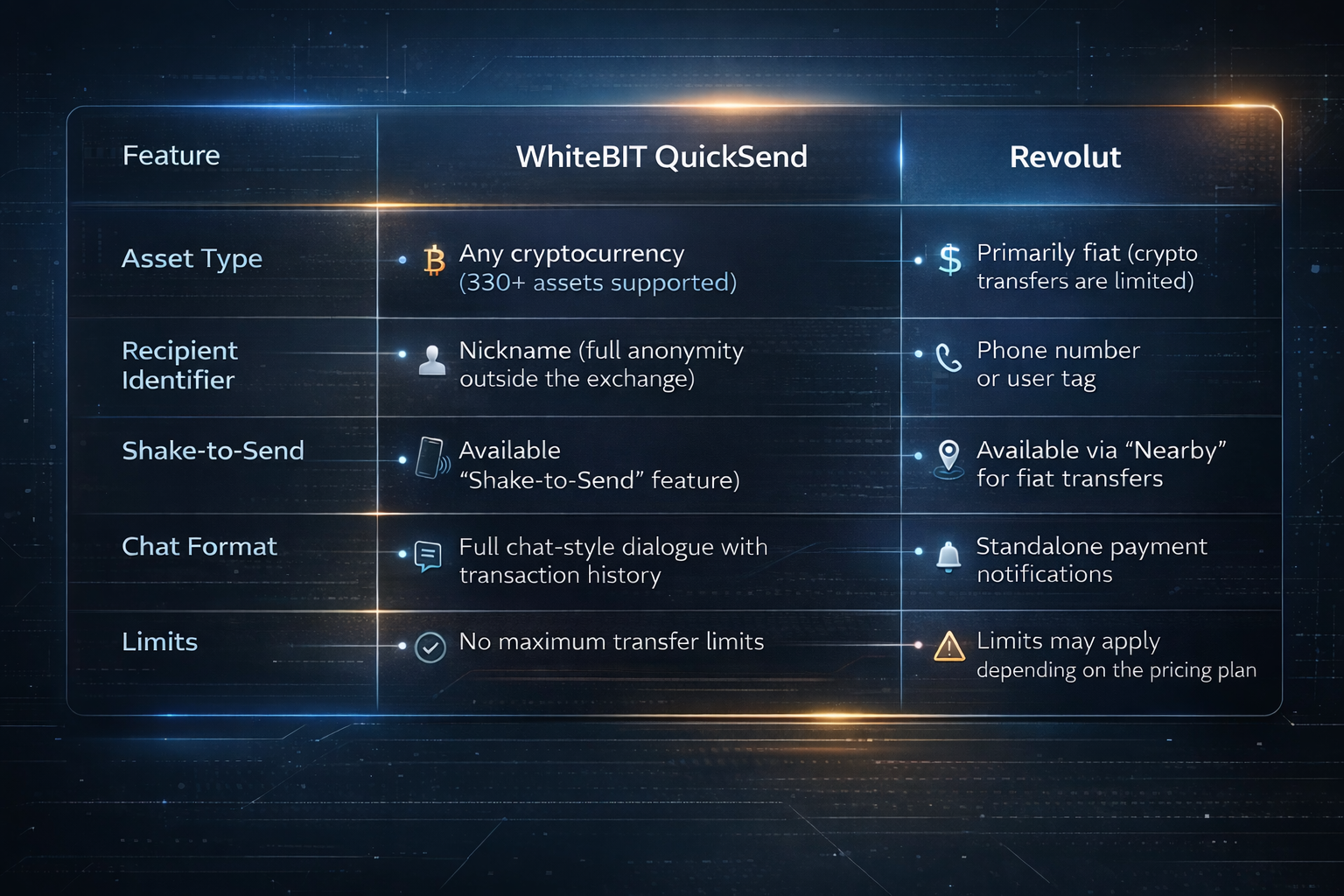 在与朋友多次交谈后,我决定比较一下Revolut和WhiteBIT的QuickSend。以下是我的观察: