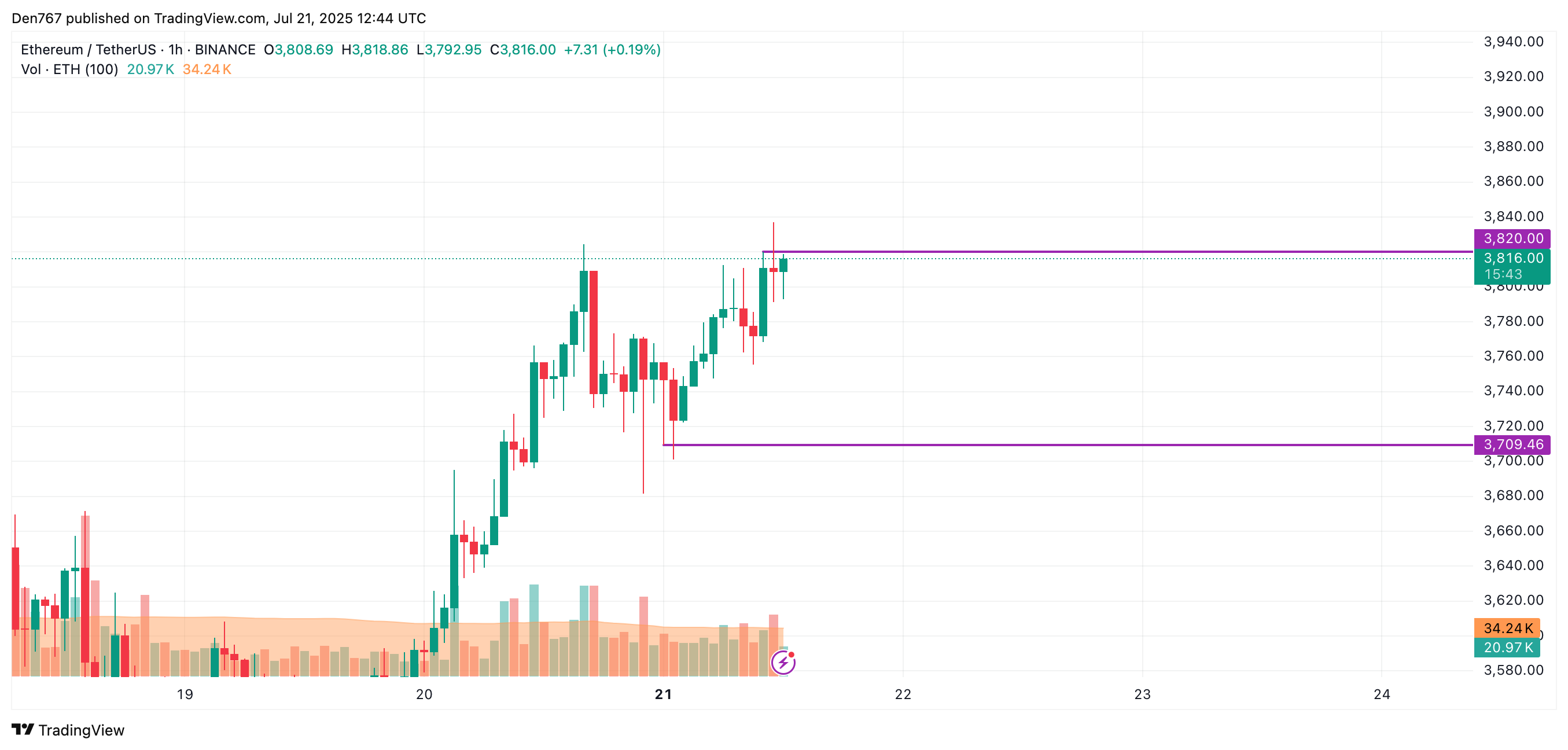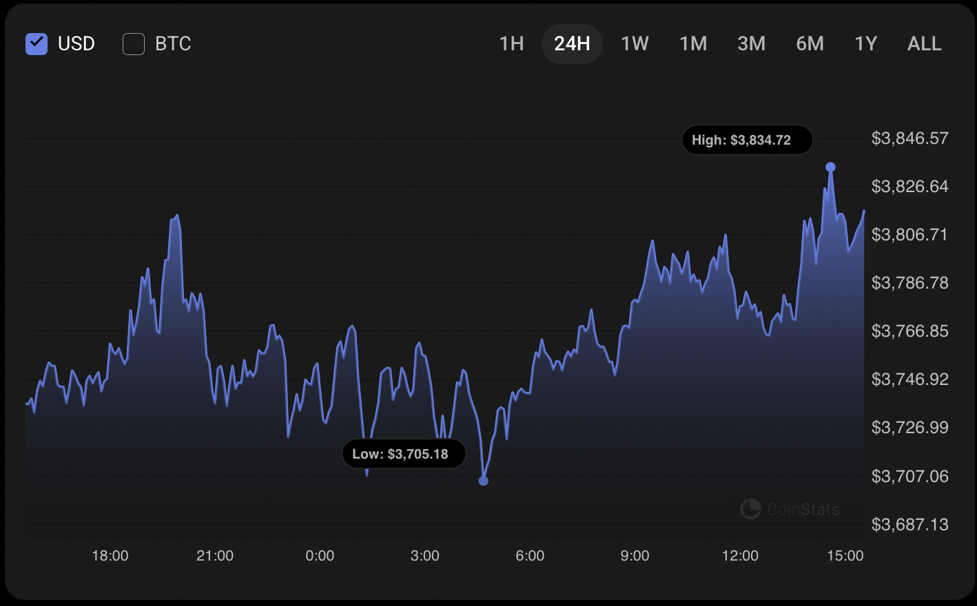 小时线图表显示ETH价格维持看涨态势,当前正试探3,820美元局部阻力位。若有效突破,价格可能继续上探3,900美元。