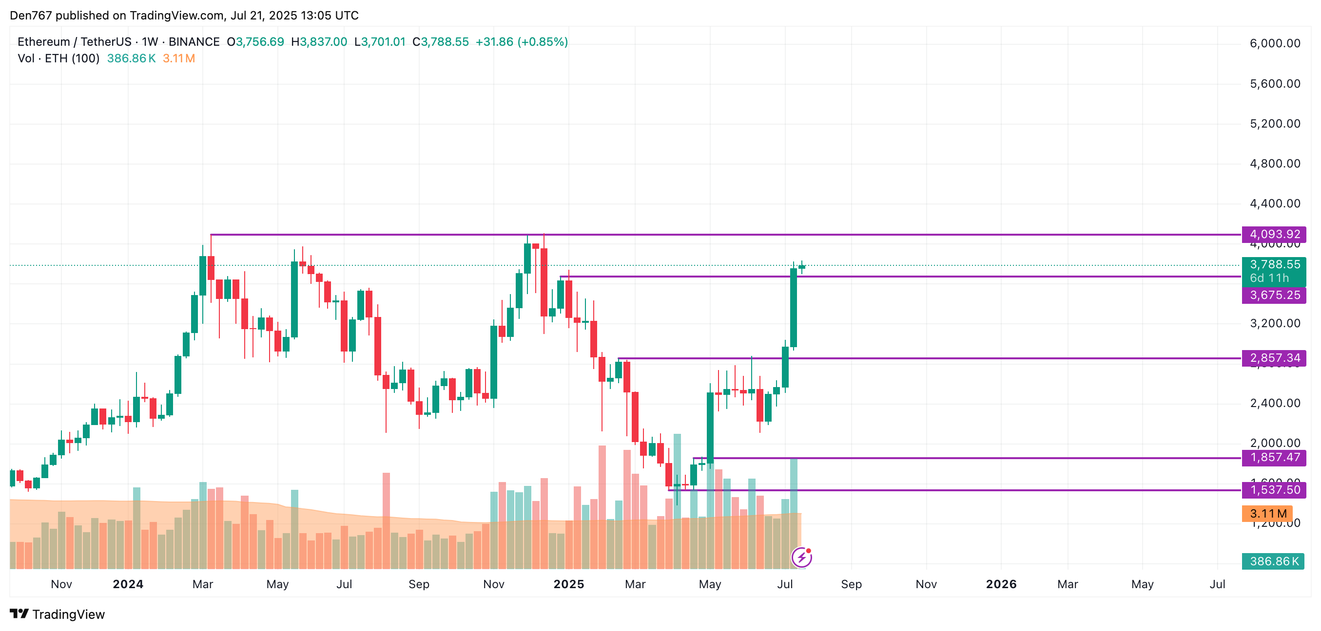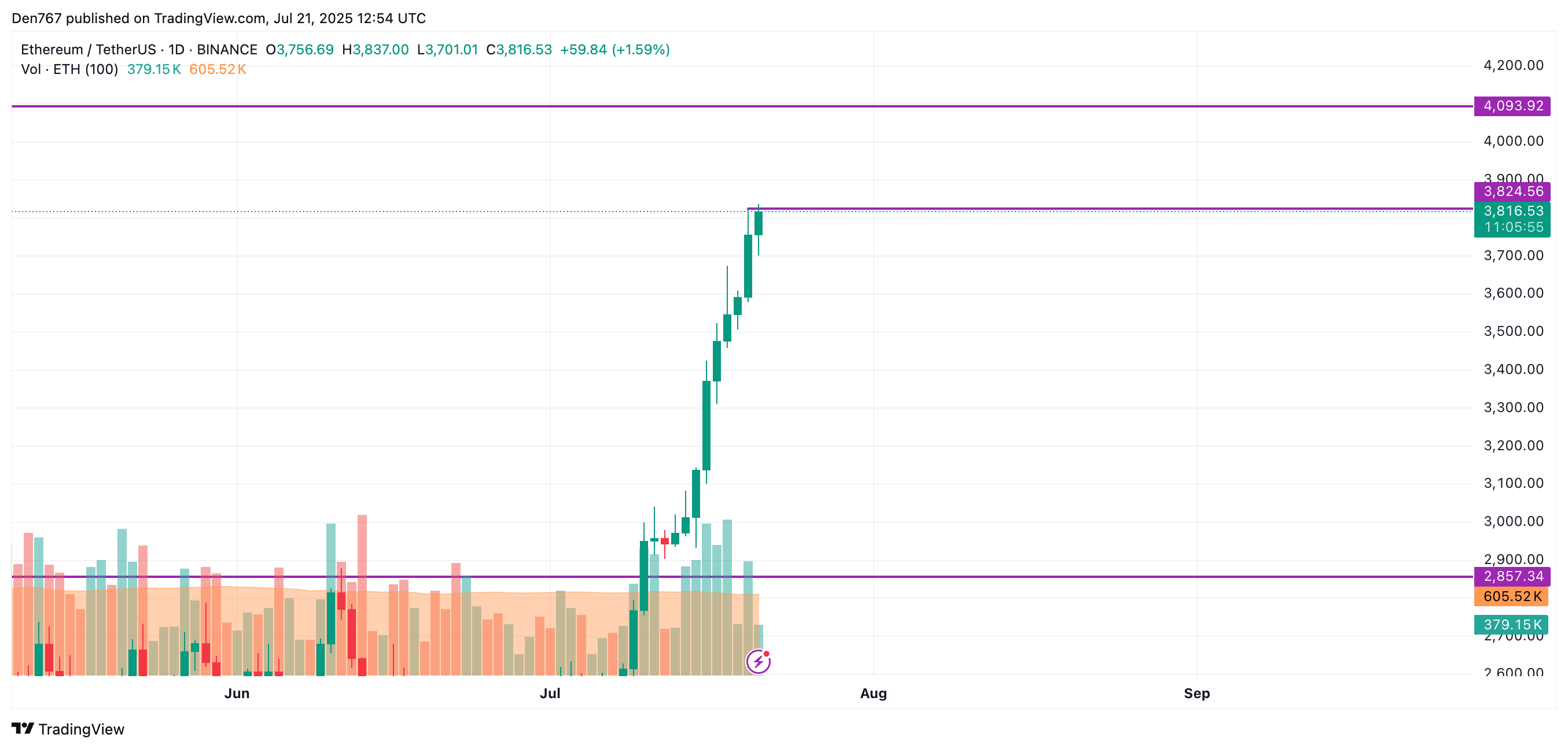 中期视角下,需密切关注3,675美元支撑位。只要ETH价格维持在该水平上方,买方将继续主导市场走势。据此推测,月底前可能出现阻力位测试行情。