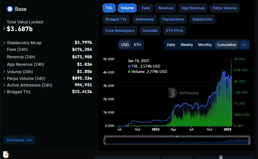 此外,Base的总锁定价值(TVL)持续增长,表明用户参与度、资产流入和生态系统内的流动性都在增加。不断上升的TVL显示了对该平台的更大信心,有助于建立更强大和可持续的生态系统。