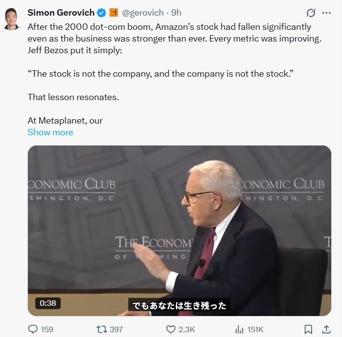 首席执行官Simon Gerovich在社交媒体发文,将公司现状与2000年代初的亚马逊类比。他引用杰夫·贝索斯当时的话:"股票不等于公司,公司不等于股票",指出Metaplanet正经历类似阶段。在他看来,股价并非总能反映公司真实状况,这种脱节可能持续数月甚至更久。