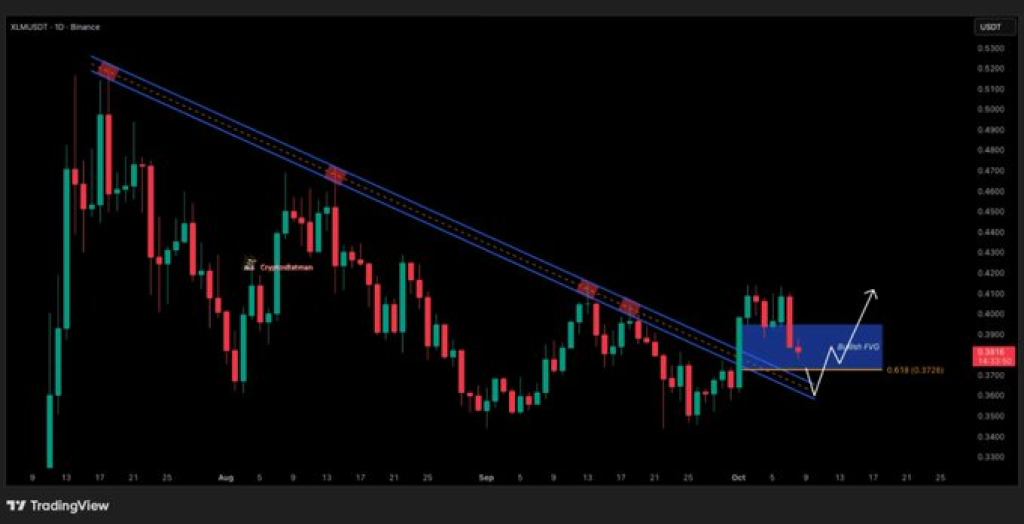 分析师同时指出,0.618斐波那契回撤位在图表中位置略低,意味着XLM价格可能小幅下探后再续升势。这种回调实际属于健康走势,市场常在继续上涨前回撤至这些技术位。因此若价格回撤至0.37-0.38美元区间,可能仅是技术性休整,届时反弹将确认看涨动能的回归。