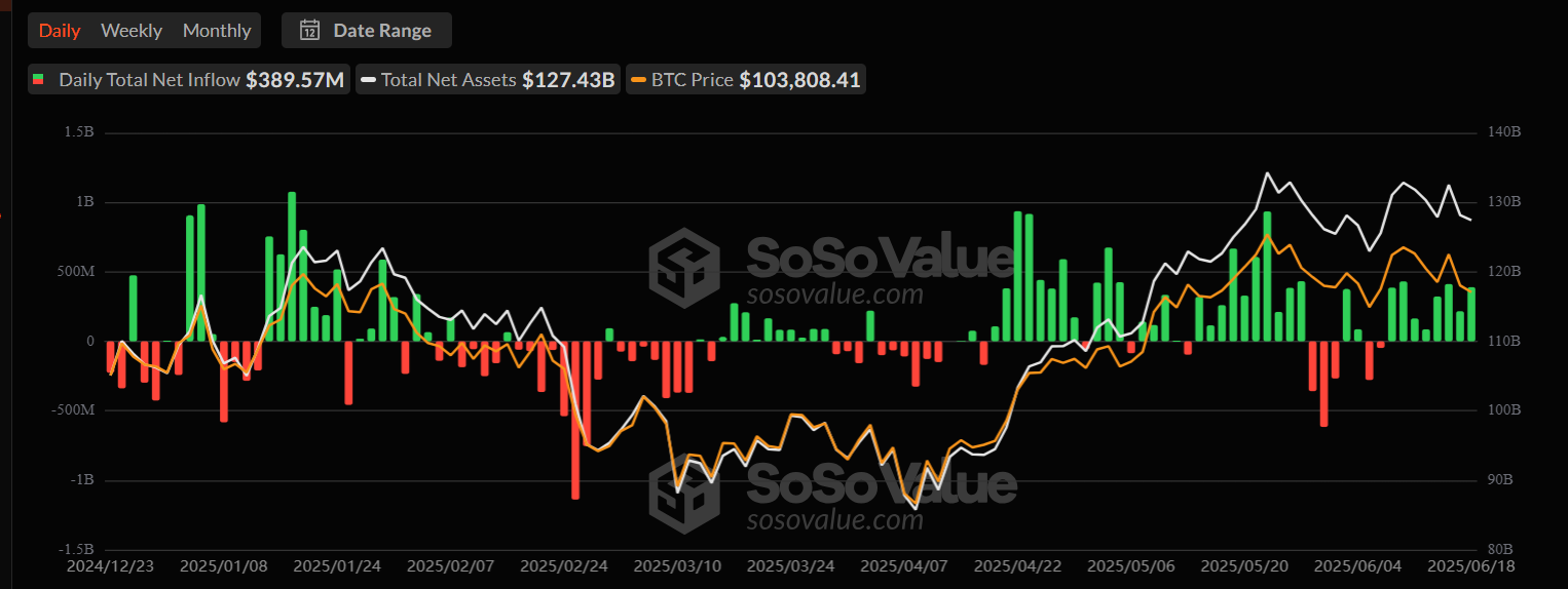 BTC价格持续获得全球采用率提升的支撑——更多企业采纳比特币战略,同时机构兴趣不减。据SoSoValue数据显示,6月9日至18日期间,美国BTC ETF连续实现资金净流入,其中6月10日单日净流入额最高,达4.31亿美元。