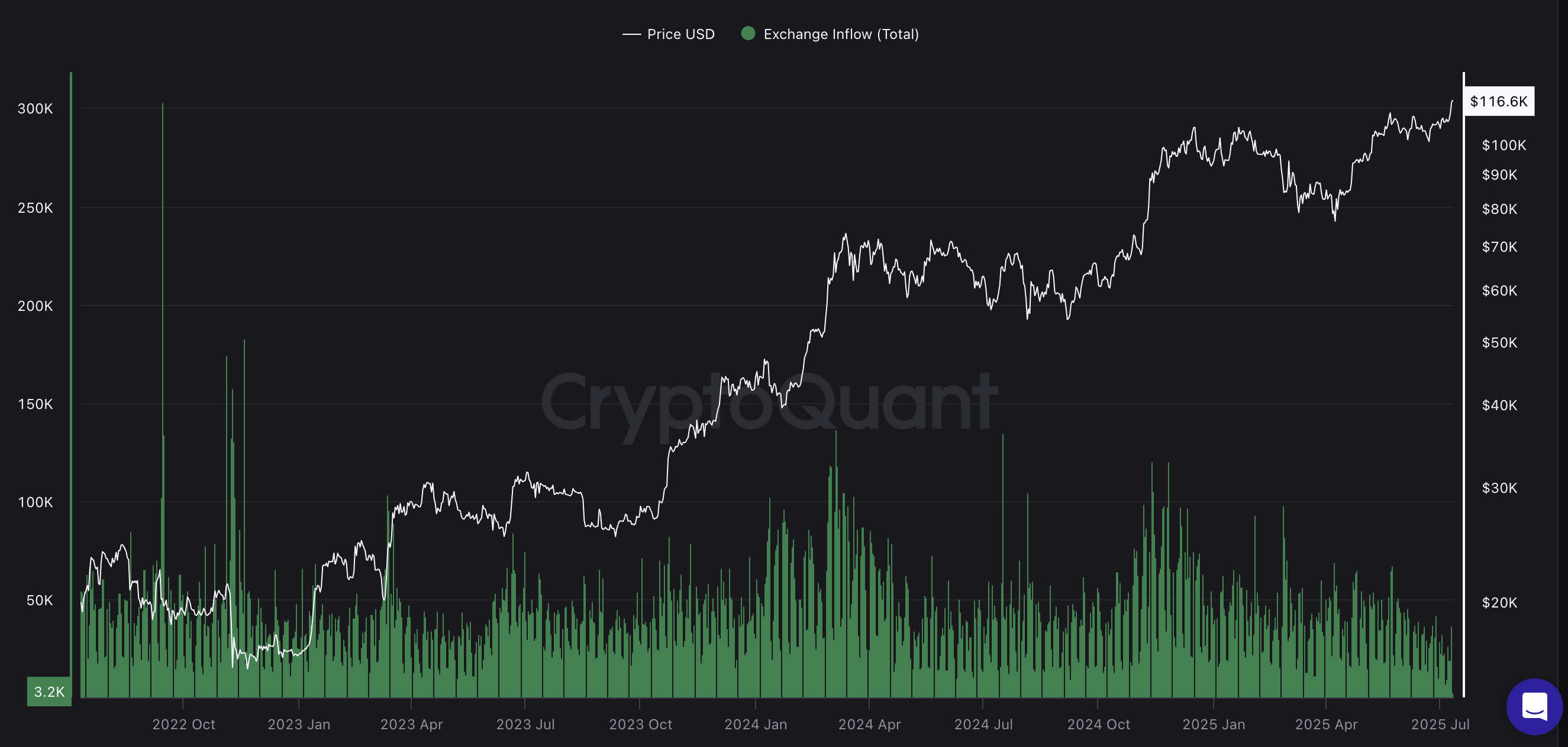 根据CryptoQuant数据显示,比特币交易所日流入量已骤降至仅32,000枚(截至发稿时),创下2015年以来最低纪录。回溯2024年12月,当比特币突破100,000美元时,这个数字还保持在97,000枚左右。