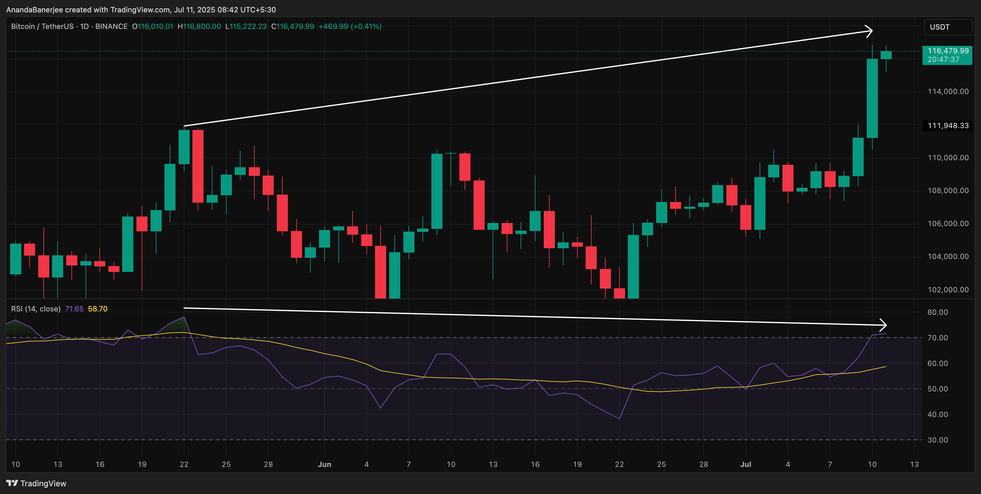 但需要保持警惕:RSI背离已经出现。若价格在109,632美元(关键支撑位之一)下方失去动能,这轮突破可能会重蹈五月覆辙,使看涨假设失效。让我们拭目以待比特币能否将这次历史新高转化为可持续的上涨趋势。