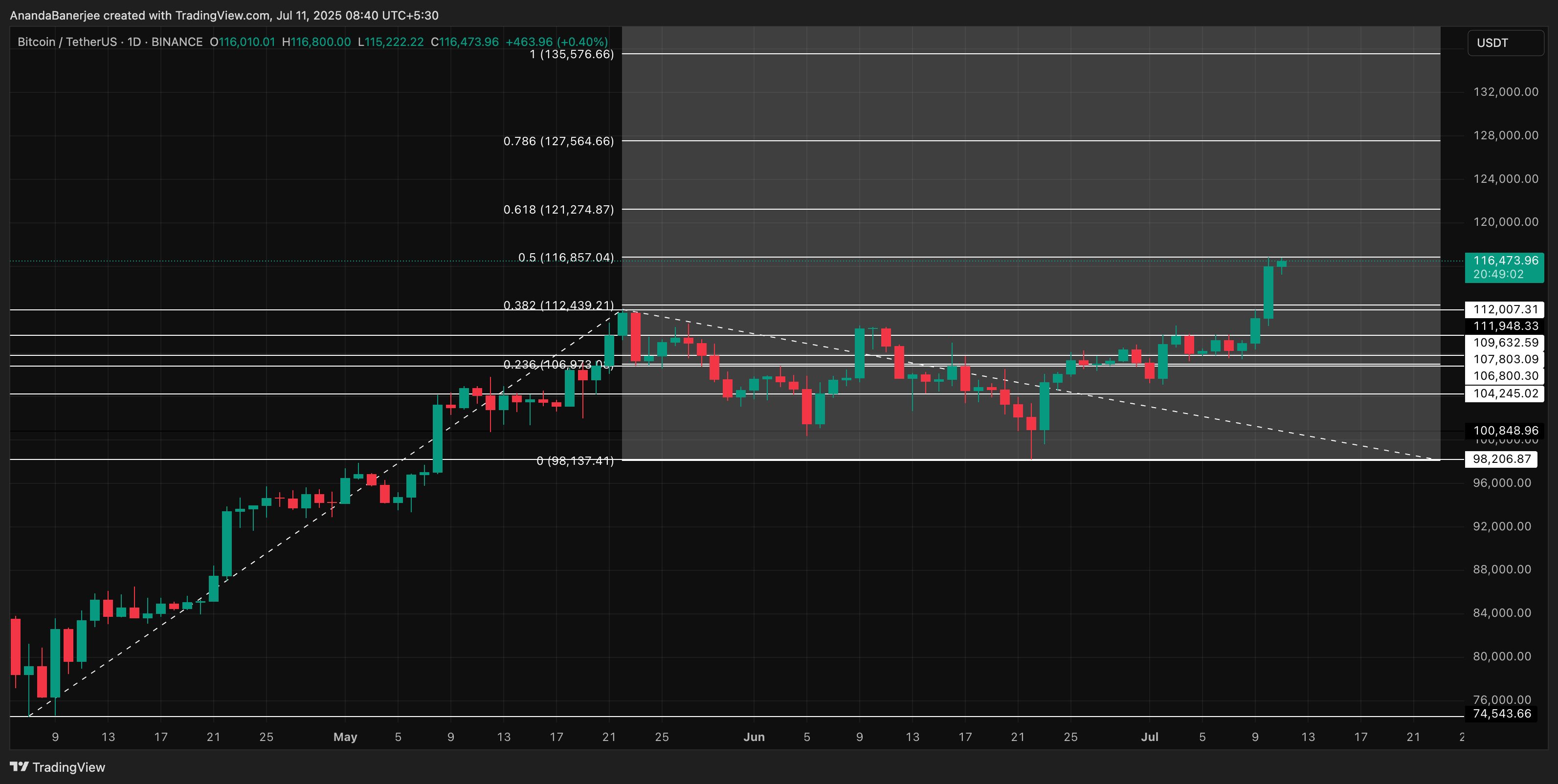 比特币现已突破五月高点,在较低的抛压、机构支持和强劲支撑集群的推动下,斐波那契分析表明仍有上行空间。