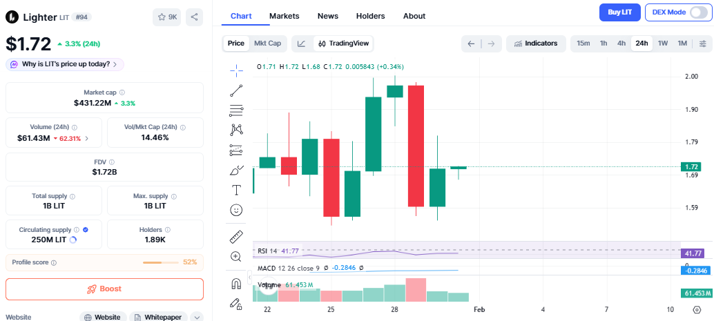 在EVM上线后,Lighter代币交易价格接近1.72美元,日内小幅上涨2.3%。这是在过去一个月大幅下跌后出现的,表明近期走势更像技术性反弹,而非强劲的看涨趋势。
