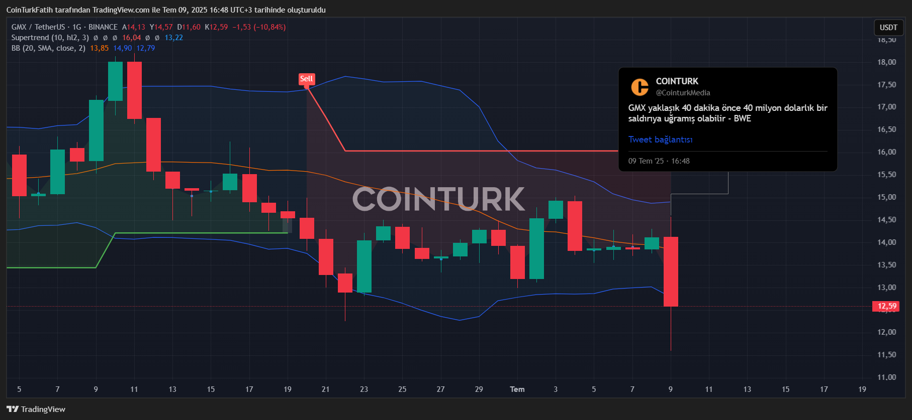 区块链安全机构BWE披露的数据显示,攻击者从GMX协议中非法提取了高达4000万美元资产。消息传出后,GMX代币价格应声下跌,从14.5美元高位急速跌破12美元关口,当前小幅回升至12.5美元附近。若抛售压力持续,市场可能下探4月调整期形成的9.7美元支撑位。