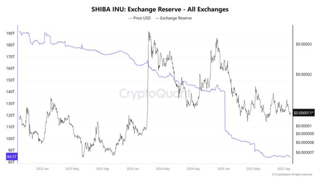 Shiba Inu(SHIB)的价格走势数月来一直起伏不定,但最新数据显示市场风向可能正在转变。分析师Crypto Zayn指出,SHIB代币的交易所储备量出现显著下降,目前仅为84.55万亿枚,价值约9.98亿美元。这是自2023年以来的最低水平,这一里程碑式数据通常预示着市场行为将发生重大转变。