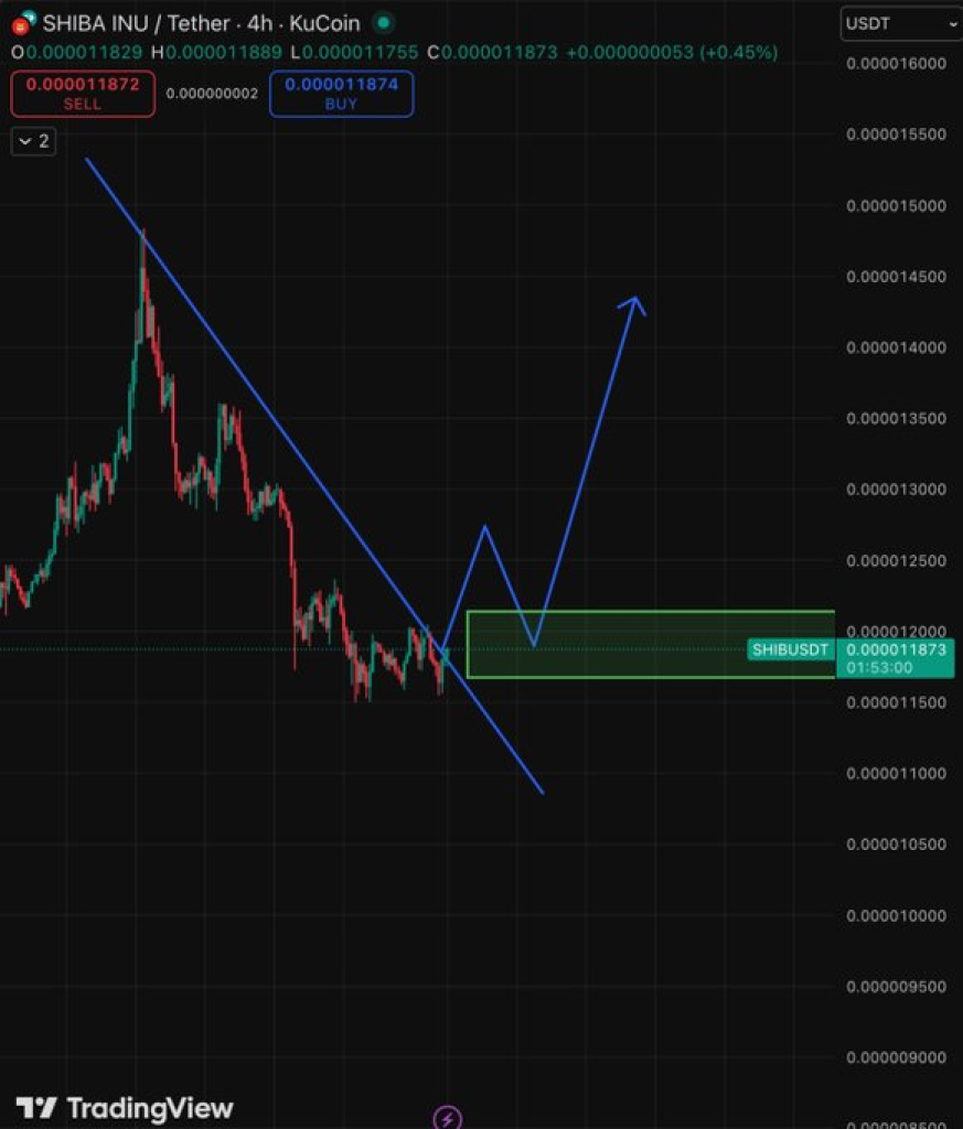 另一位X平台分析师Blacksea从不同角度观察到了相同趋势。他的4小时周期图表显示,SHIB价格正在突破明显的下降趋势线。虽然这一走势刚刚开始,但他指出若收盘价能站稳趋势线上方,短期内可能打开进一步上涨空间。