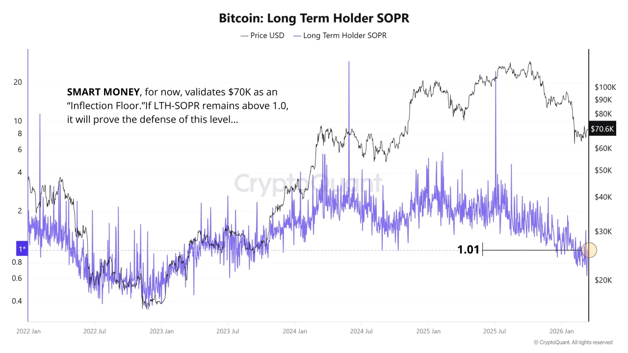 比特币维持在70,000美元上方,长期持有者正以当前水平捍卫其成本基础。LTH-SOPR指标读数为1.01,这一数值在历史上通常标志着市场投降与坚定持有之间的分界线。