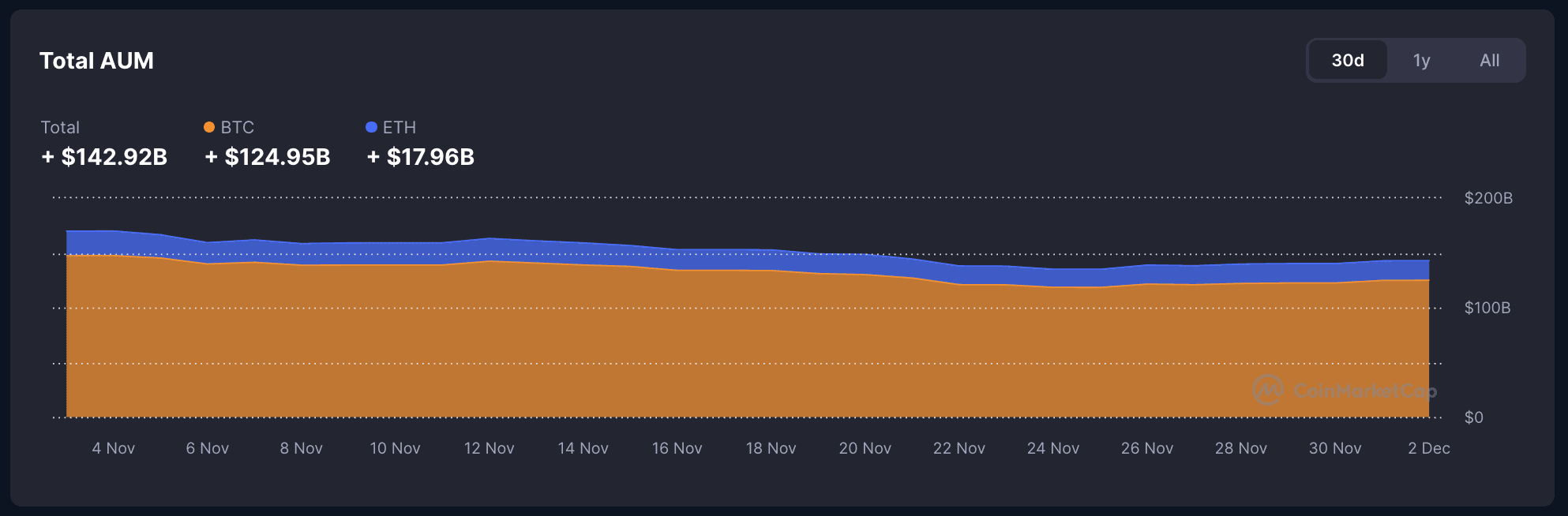截至2025年底,现货比特币ETF管理资产规模已累积约1250亿美元,其中贝莱德的iShares比特币信托在近期波动调整后持有约700亿美元。同期以太坊现货ETF管理资产规模接近180亿美元。