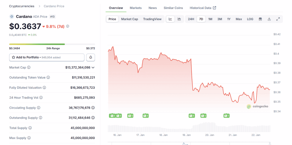 在近期回调后,卡尔达诺继续在0.36至0.40美元区间内交易,反映出市场情绪谨慎。追踪卡尔达诺价格预测的分析师指出,ADA曾短暂测试0.35至0.37美元附近的支撑位,该区域被视为维持稳定的关键。