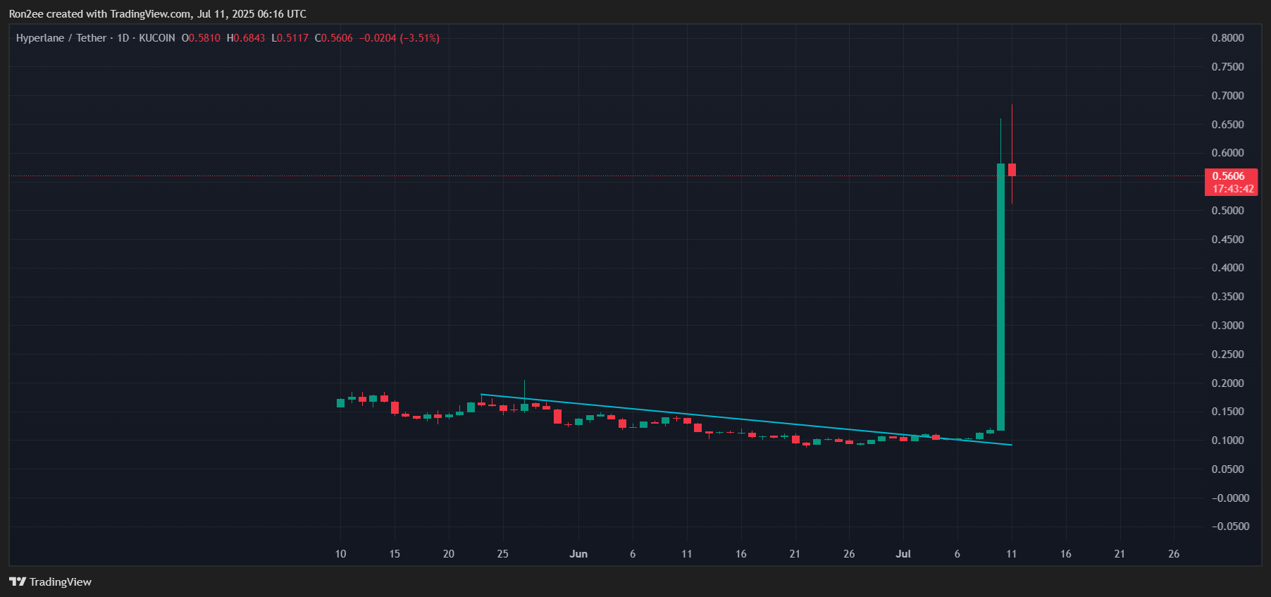 根据crypto.news数据,Hyperlane(HYPER)在亚洲时间7月11日上午飙升至历史新高0.66美元,截至撰稿时稳定在0.61美元附近。过去24小时涨幅达100%,近两个交易时段累计上涨超过450%。