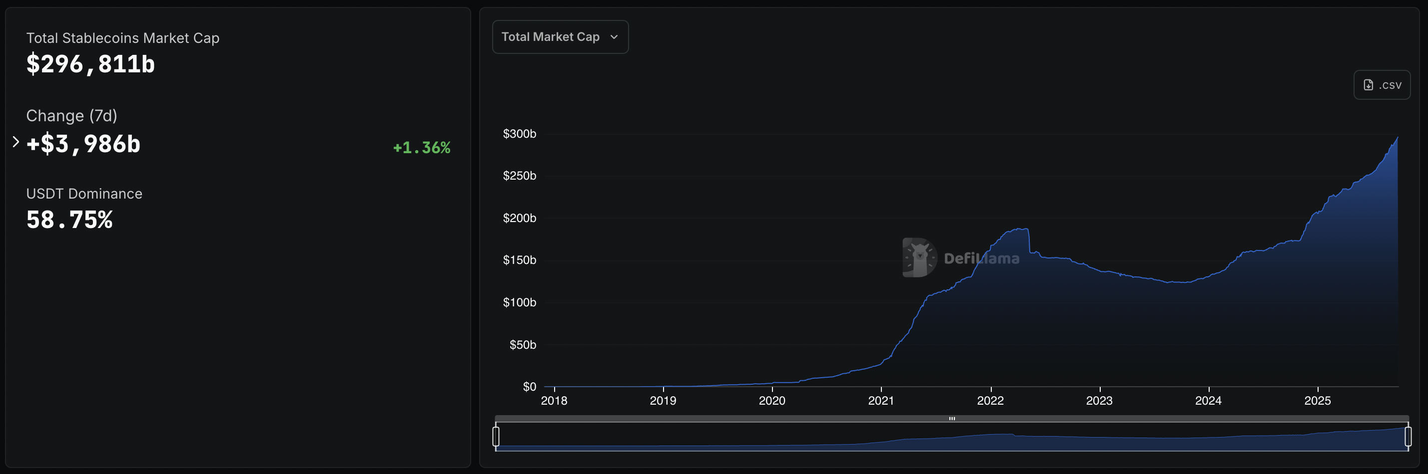 根据DefiLlama数据显示,加密货币市场关键指标——稳定币总供应量于9月28日达到2968.1亿美元的历史新高,24小时内增长1.36%。分析人士认为,稳定币供应量攀升预示着市场流动性将显著增强,尤其对于比特币和以太坊而言,这将有效缩窄买卖价差。
