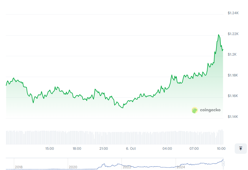 BNB市值已稳定增长至约1694.6亿美元,凭借投资者高度参与及广泛市场认可,稳居顶级数字资产行列。该代币过去24小时交易价格介于1149.88至1220.63美元区间,当前涨幅达4.2%。