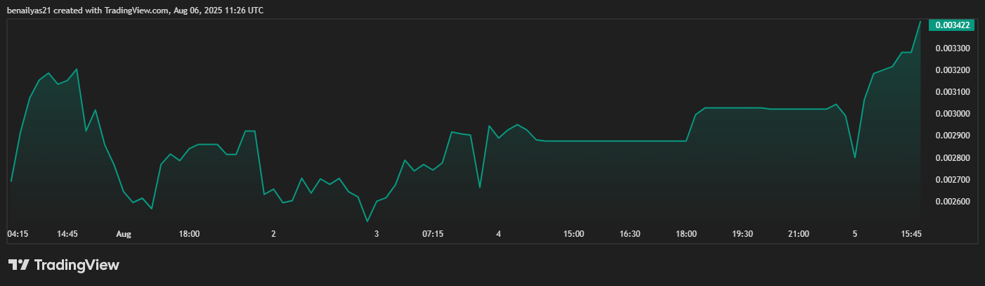 交易者正关注0.00366美元阻力位,若平台能维持20万美元以上日收入且市场对Meme币热情持续,价格目标可上看0.00418美元甚至0.0050美元,较现价存在近50%上涨空间。