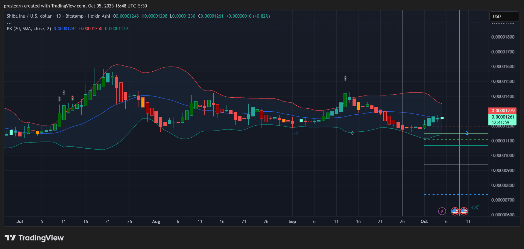 通过日线图(Heikin Ashi蜡烛图配合布林带指标)观察,SHIB目前交投于0.00001261附近。经过9月下旬的持续下跌后,代币价格从布林带下轨0.00001139附近反弹,正试图收复0.00001244的中轨位置。