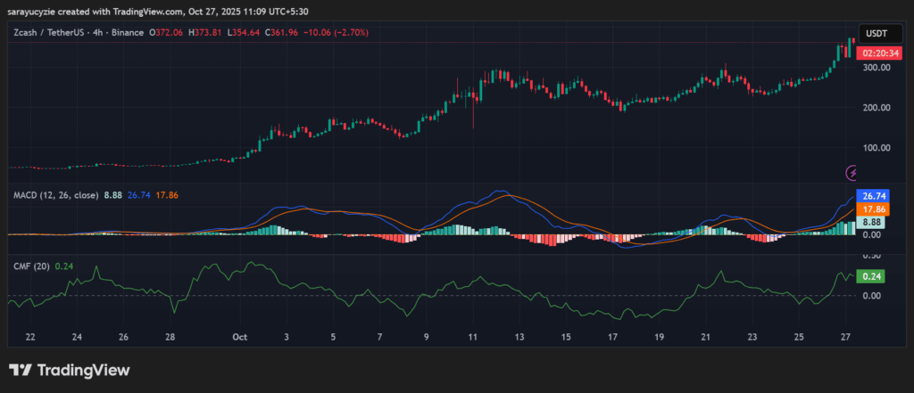 技术分析显示,Zcash的MACD指标线上穿信号线,暗示动能正在转向多头,价格可能持续攀升。此外,0.24的CMF指标值表明市场存在强劲买压。资金流向数据证实投资者正在积累而非抛售该资产。