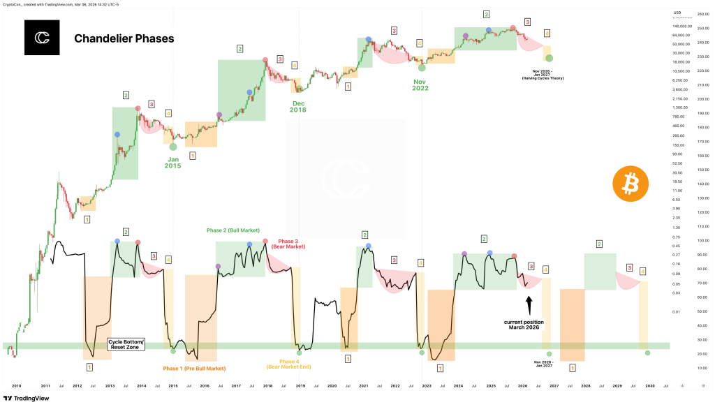 他所分享的图表基于其提出的"吊灯阶段"理论,该框架将每个比特币周期划分为数个不同阶段。