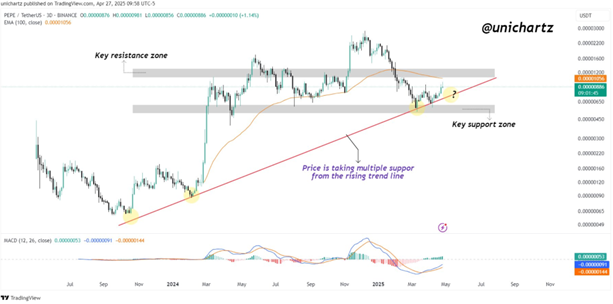 虽然狗狗币可能是市场的表情包之王,但Pepe Coin(PEPE)正在悄然构建争夺王位的理由。根据UniChartz的说法,PEPE以教科书般的精确度尊重上升趋势线,这是强劲、持续看涨控制的信号。