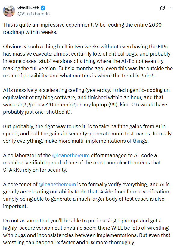 Buterin提议将AI驱动的效益在快速编码和更深度的安全审查之间进行分配。他建议,效率提升的一半应用于扩大的测试案例和形式化验证。