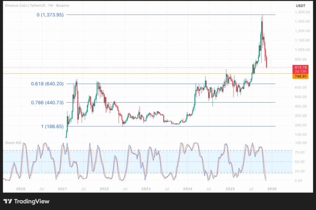 从当前价格走势观察,BNB短期内可能面临进一步下行风险。交易员正密切关注747美元水平支撑位,而0.618斐波那契回撤位对应的640美元关口,或将构成更深层次回调的关键节点。