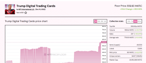 链上NFT数据平台nftpricefloor.com统计显示(该平台追踪超10条区块链网络数据),特朗普数字交易卡在交易量与地板价方面均实现显著增长。过去一个月间,该系列创下199,005枚MATIC成交额,环比增幅达250%。