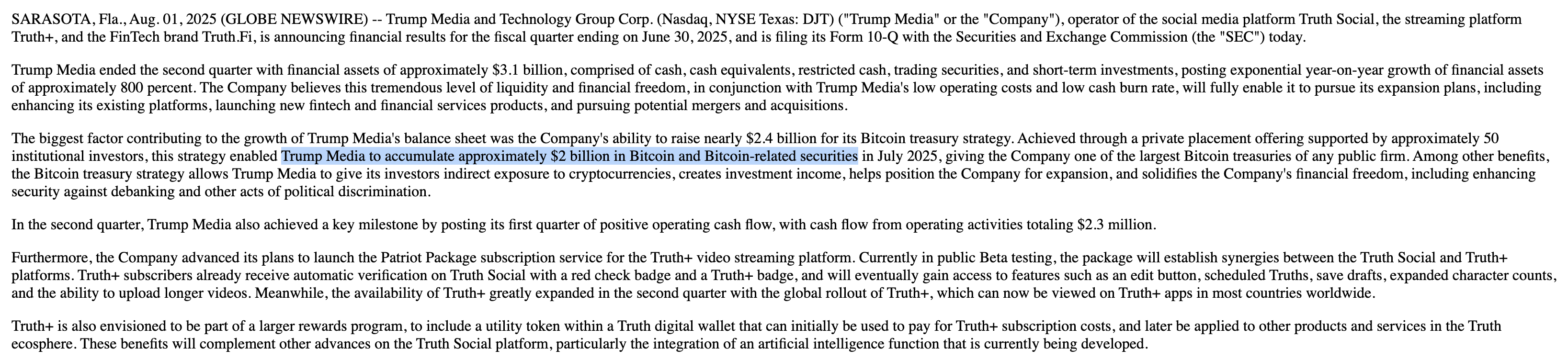 由美国前总统唐纳德·特朗普创立的特朗普媒体与技术集团(TMTG)在2025年第二季度报告中证实,其持有的比特币及相关证券资产价值达20亿美元。这一庞大持仓使该公司跻身美国上市公司中最大的加密货币持有者行列。报告显示,公司总金融资产增至31亿美元,并首次实现运营现金流转正。
