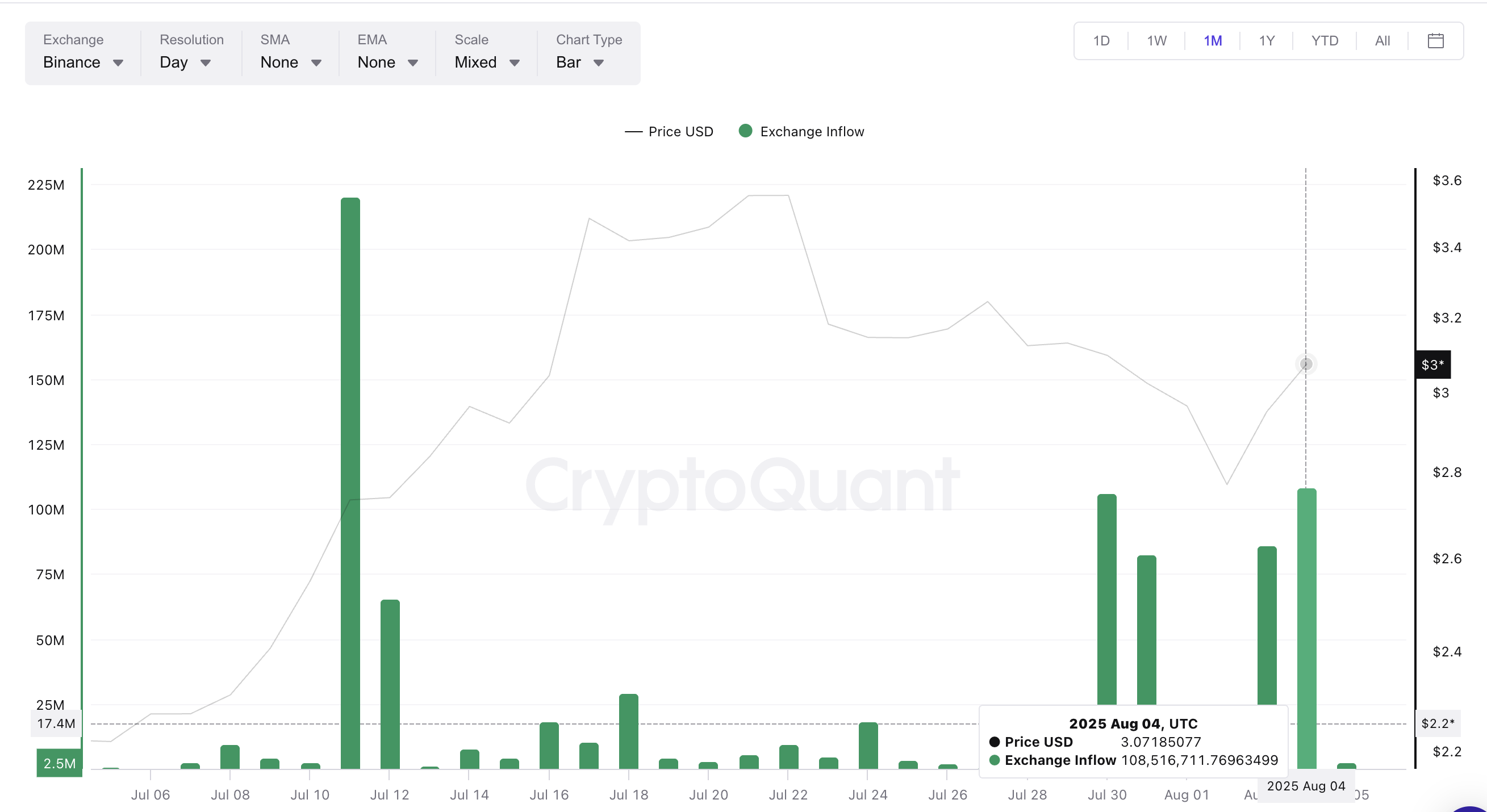 历史数据显示8月通常是XRP波动剧烈的月份,当前价格正处于关键节点,3美元附近交易者和鲸鱼的行为将决定后续走势。一个重要原因是交易所卖压持续增加——自7月30日价格逼近3美元后,净流入量再度攀升。