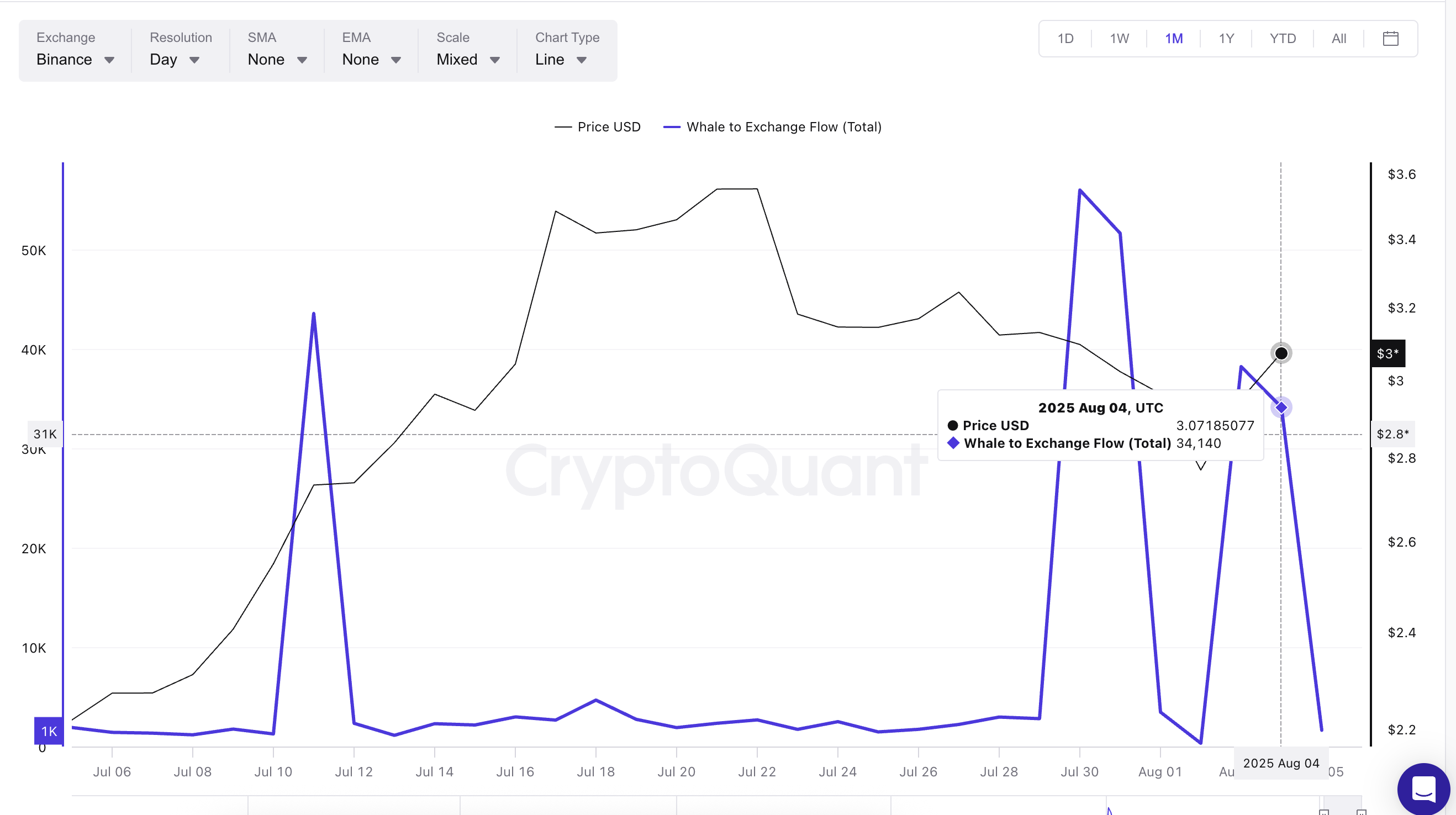 链上数据显示,鲸鱼在近期上涨中持续抛售:7月30日当价格跌破3美元时,交易所单日鲸鱼流入量达55,000 XRP(月内峰值);8月3日价格再探3美元时又出现38,226 XRP的流入。
