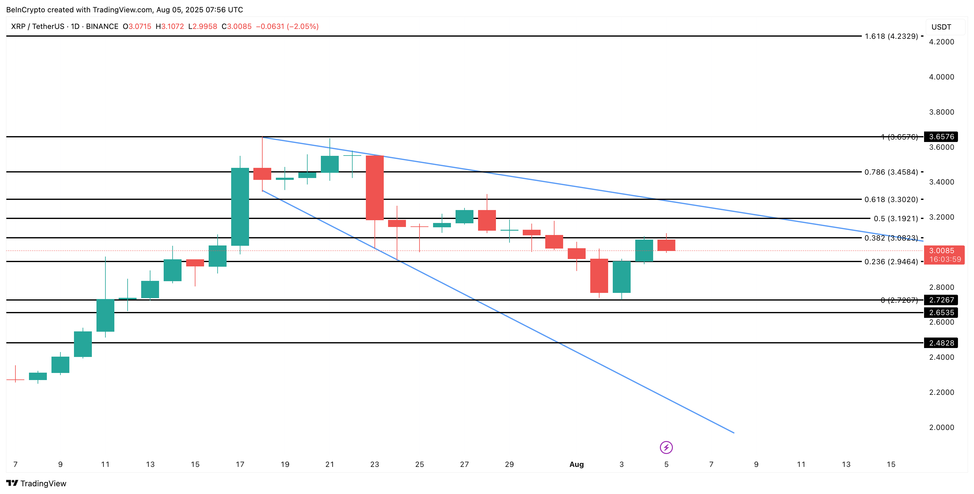 但8月4日流入量降至34,140 XRP,与价格回升形成背离。这可能意味着鲸鱼转向观望,或暗示卖压暂时缓解——无论哪种情况都对短期走势构成利好。