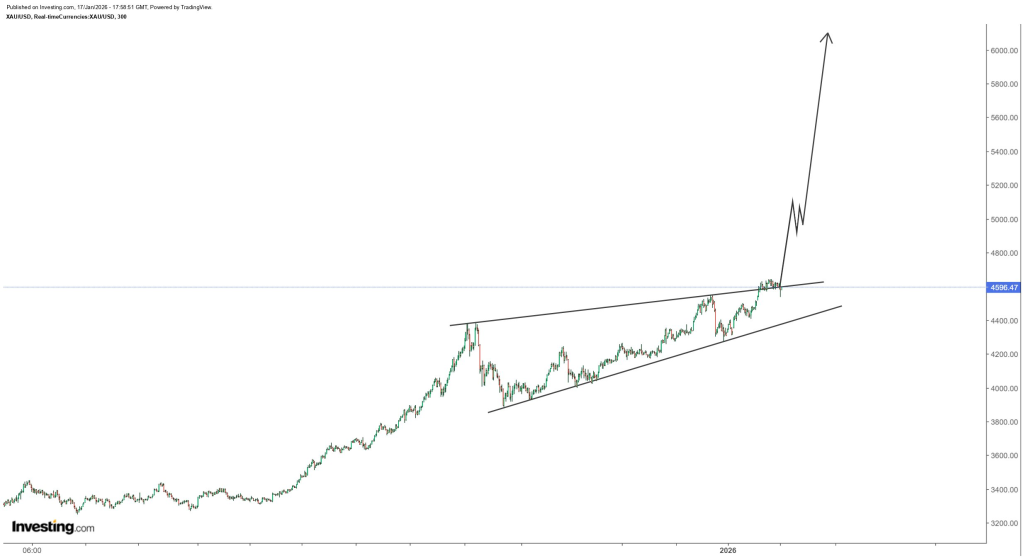 投资分析师拉沙德·哈吉耶夫分享了图表与研判,其技术结构一目了然:黄金价格在持续三个月的上升楔形内震荡走高,目前正测试该形态上轨阻力区域,约位于4600美元附近。