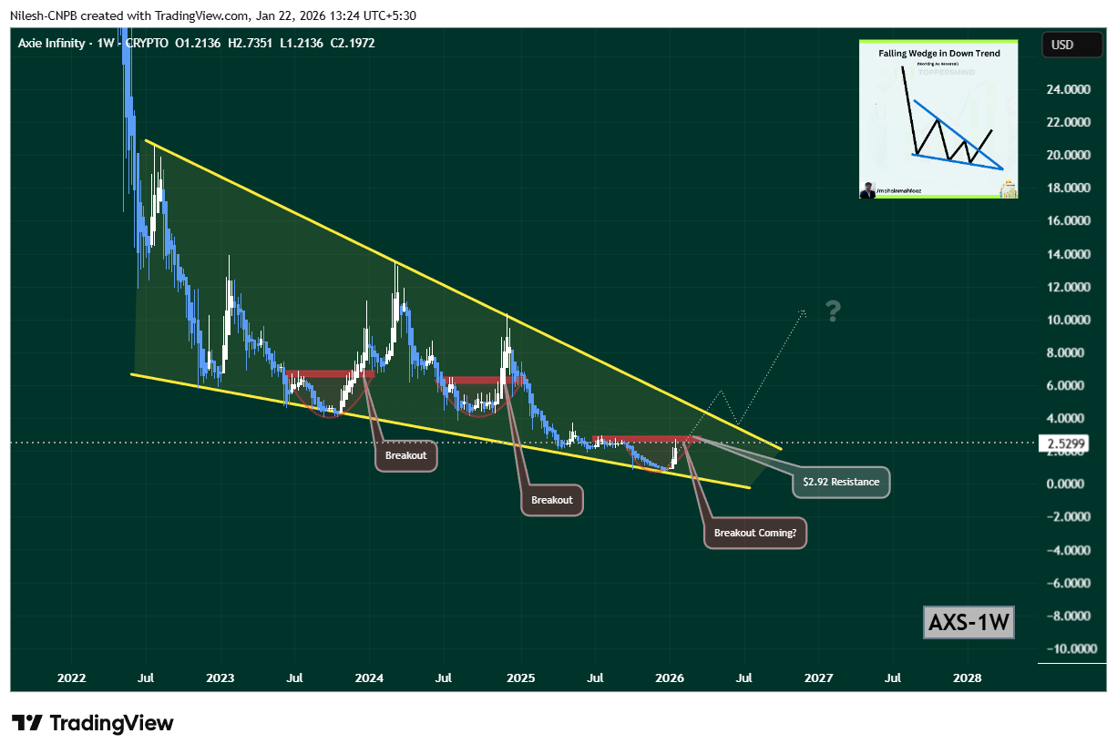 从技术视角观察,AXS/USD周线图呈现出值得关注的信号。自2021-2022年牛市见顶以来,AXS始终运行于一个大型下降楔形形态内——这种结构当价格压缩至下轨附近时,常预示着看涨反转。