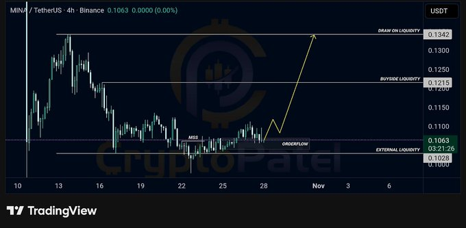 分析师Crypto Patel分享的MINA/USDT图表清晰显示,较低时间框架上已确认市场结构转变(MSS)。这种技术现象通常标志着空头与多头力量对比正在改变,随着抛压减弱,短期动能开始向买方倾斜。