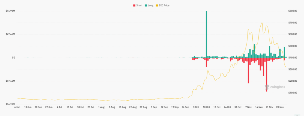 ZEC流动性分布图显示,价格正受到强劲的下行压力,逐步逼近300美元附近的主要清算密集区。最新推文指出,当前震荡下行的价格走势与清晰的流动性路径以及逐渐稀薄的支撑位高度吻合。巨额成交量反映的是强制平仓行为,而非可持续的资金积累或市场企稳迹象。在持续卖压推动下,ZEC现交易于317.82美元附近,正逐步逼近关键清算带。市场表现与流动性数据揭示的向低位密集区持续下移的趋势如出一辙。