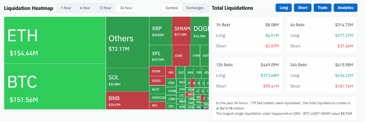 周二比特币从历史高点回落之际,加密货币市场掀起大规模强平浪潮,24小时内超过6亿美元的杠杆头寸遭到清算。Coinglass数据显示,此次暴跌主要集中在比特币和以太坊,两者合计占清算总额近60%。热力图显示币安、OKX和Bybit平台出现大量多头头寸爆仓,表明上周市场狂热后杠杆率已过度扩张。