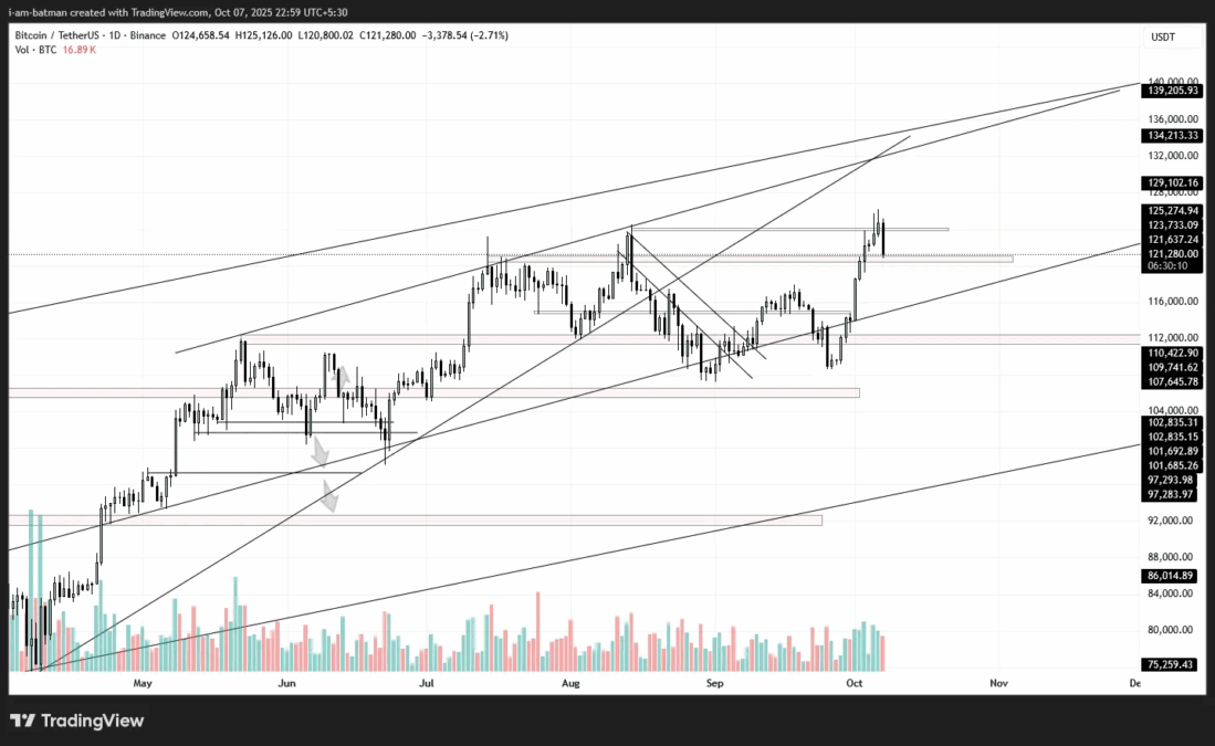 比特币上周短暂突破125,000美元创下历史新高,随后在获利回吐和宏观不确定性影响下回落至121,000美元。从技术面看,价格在125,000美元附近遭遇明显阻力,此处恰逢数月上升通道上轨。日线图显示,该资产在从近期高点回调7%后,目前正围绕121,000美元整固并测试短期支撑。