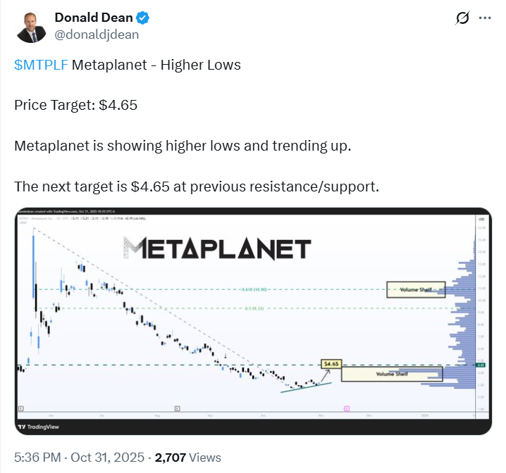 经济学家Donald Dean在社交平台分析Metaplanet价格图表时指出,该股已形成看涨模式。如图所示,MTPLF呈现出一系列逐步抬高的波谷,每个低点都高于前次,且买盘在更浅的回调位置介入。