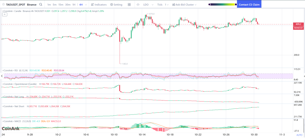 净多头敞口继续强于净空头,显示市场信心未减。410-420美元支撑区域持续有效,每次触及该区域都有买盘护盘。这是TAO价格需要守住的关键防线,以避免陷入更深回调。