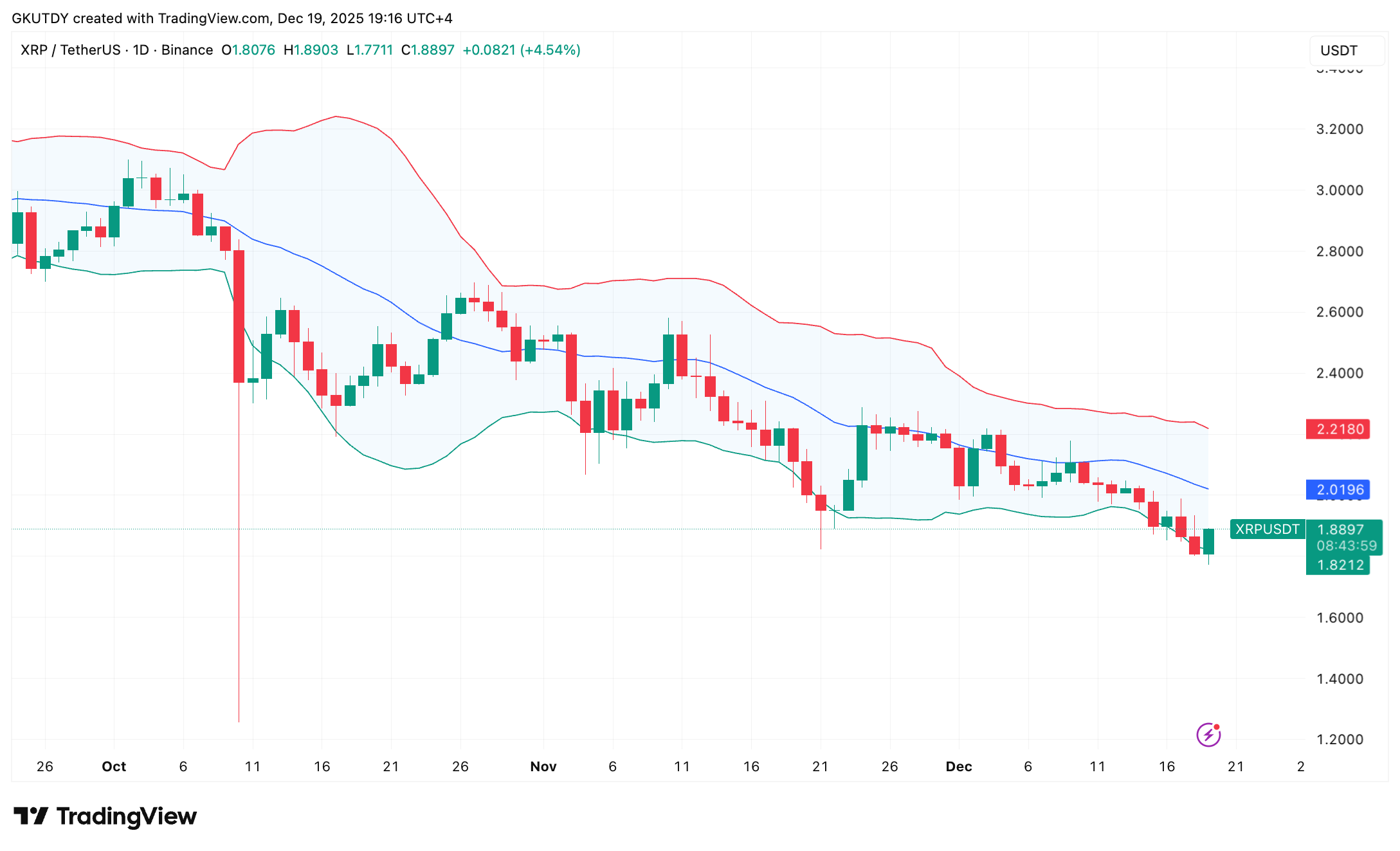 XRP正试图在2025年底达成一个看似简单实则艰难的目标——站稳2美元关口。TradingView提供的XRP/USDT日线布林带指标清晰揭示了当前空间的局促:价格仍徘徊于布林带中轨下方,意味着市场尚未收复关键趋势基线。通常需先突破该基线,资产才可能真正获得重返高位的动能。