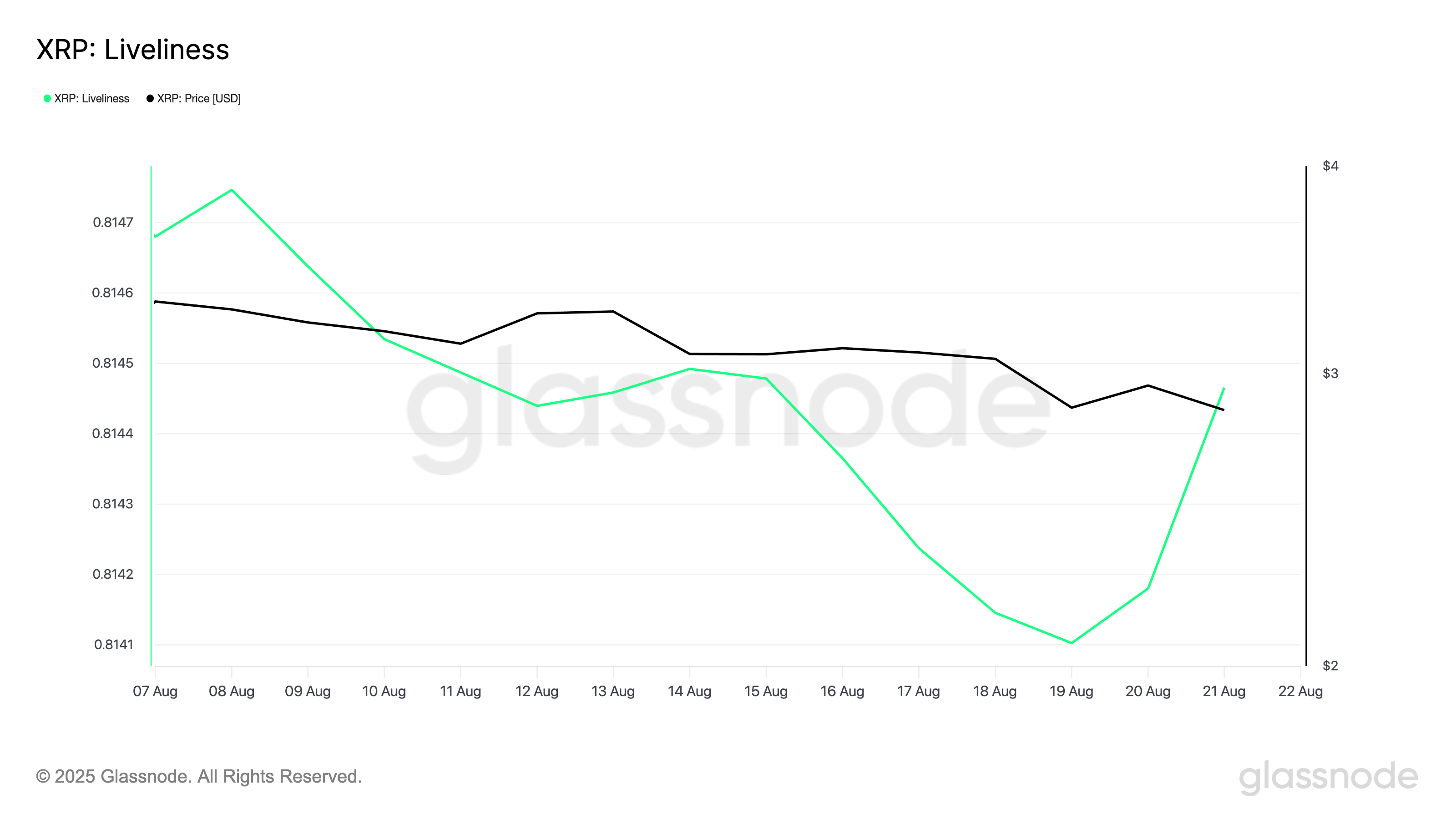 这种乐观情绪与长期持有者(LTH)的行为形成鲜明对比。XRP活跃度指标自8月19日以来持续攀升,该指标通过计算"销毁币天数"与"累计币天数"的比率,追踪长期休眠代币的移动情况。当指标上升时,意味着长期持有者正在转移或抛售代币;而指标下降则被视为看涨的囤积信号。