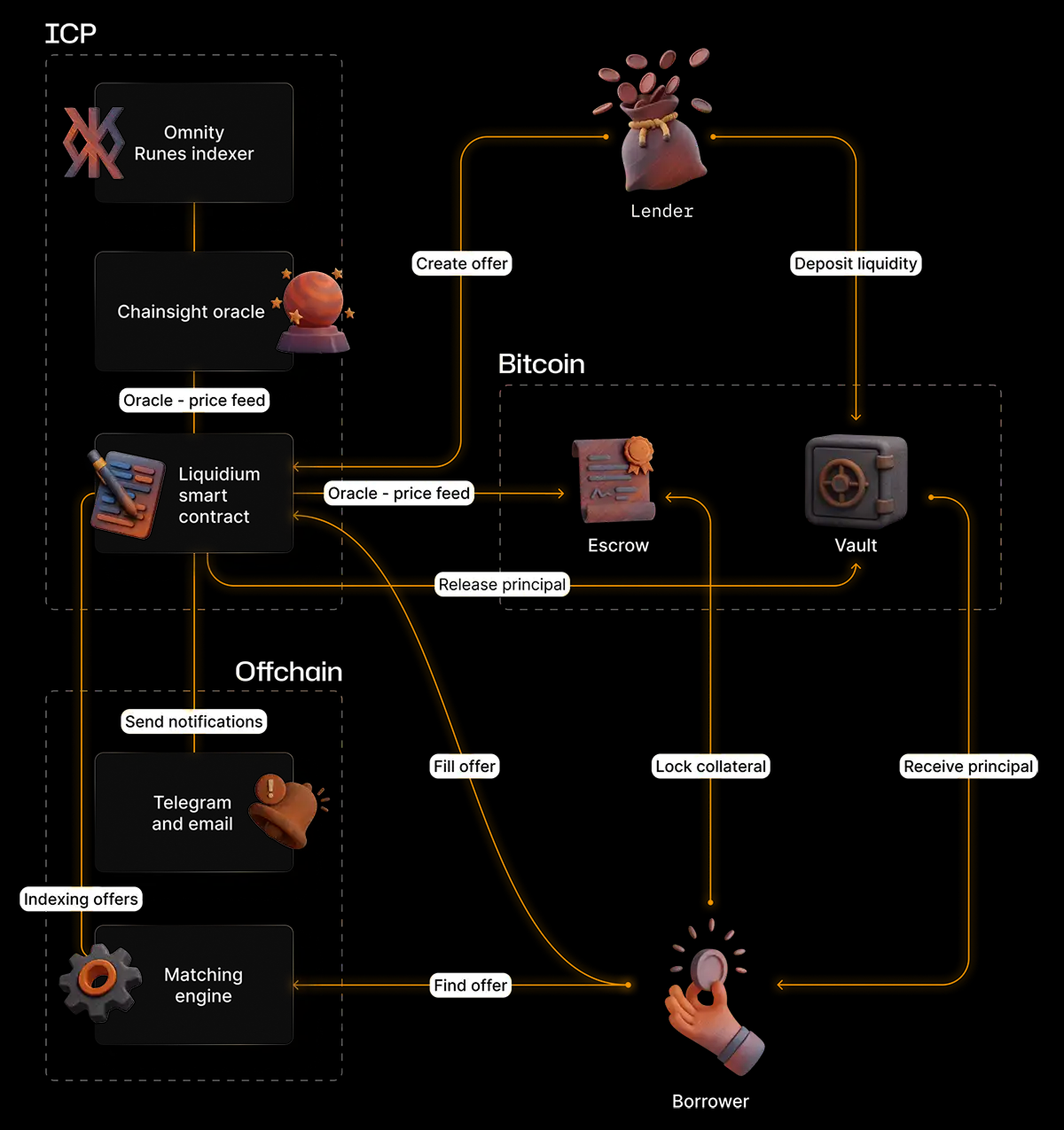 LiquidiumWTF 智能合约验证 PSBT 是否符合借贷条款。可靠的抵押品价格信息由基于 ICP 的项目 Chainsight 和 Omnity 提供。